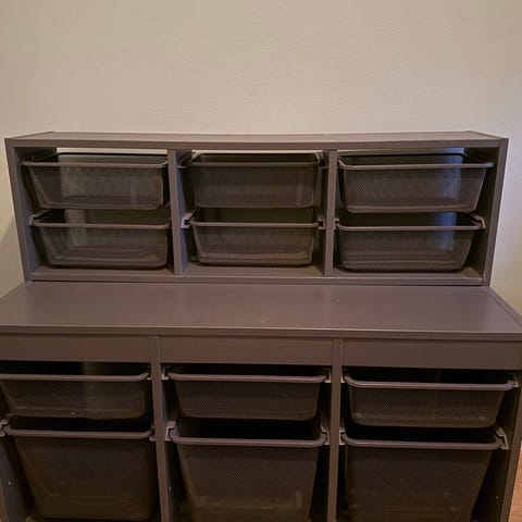 Förvaringsställ med trådkorgar och tygskynke