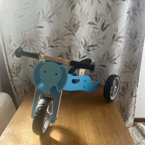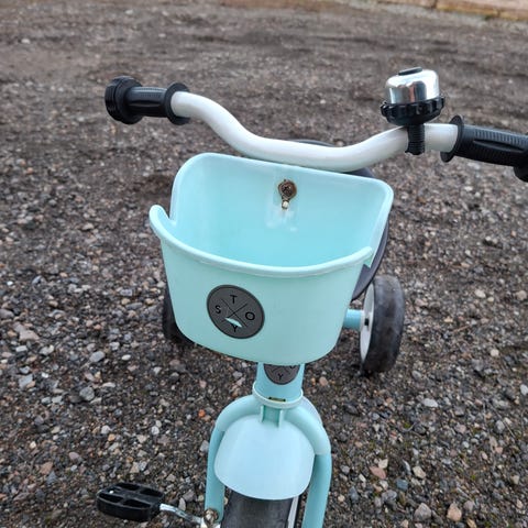 Trehjuling barncykel med hjulstorlek 10 tum. Cykeln har blå ram, gula hjul och röd lastbalja bak. Sadel och pedaler är i plast och styret har handtag med ändskydd. Passar mindre barn som första cykel/trampfordon på plan mark, exempelvis i trädgård eller på gård.
