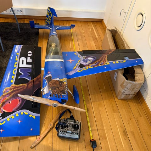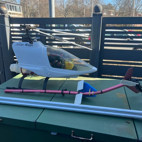 Radiostyrd modellhelikopter med förbränningsmotor och tillhörande fjärrkontroll. Helikoptern har två huvudrotorblad och ställning i metall. Bränsletank och motor är monterade i ramen, med drivning via kugghjul. Medföljer separat radiosändare med två spakar och flera reglage, samt transportväska. Lämplig som radiostyrt modellflygplan för hobbybruk och eventuellt reservdelar eller vidare byggprojekt.