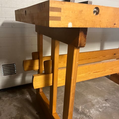 Fin gammal bänk. 2st bänkhakar ingår. Skruvtvingar gjorda i trä 2st. Prynad eller som hobby? 60cm bred, 75cm hög, 143cm lång. En spånplatta finns med om man så önskar till en hylla under bänken.
