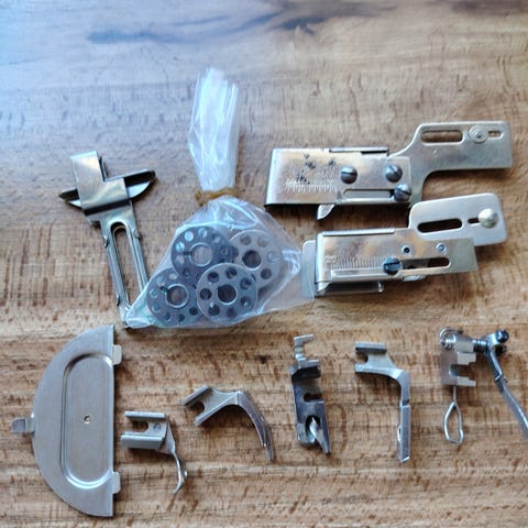Förvaringsfack med tillbehör (spolar, pressarfötter, nålar m.m.)
