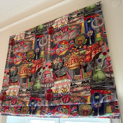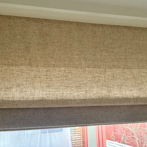 Måttsydd hissgardin i fint linnetyg. Fodrad baksida, stänger ute ljus väl. Fästs med kardborrband på träribba som skruvas upp över fönster. 140 bred, 160cm lång.