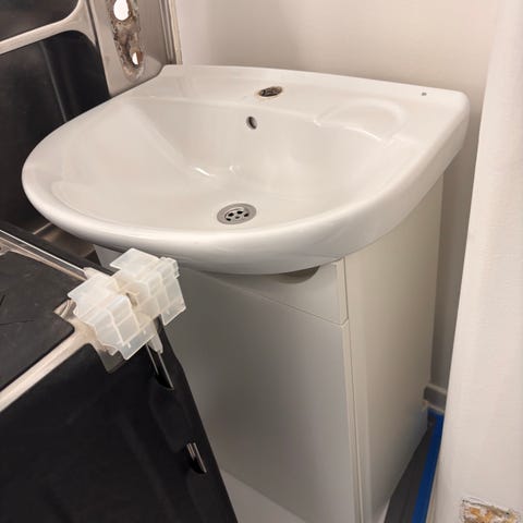 Tvättställ med underskåp i vit färg. Tvättstället är integrerat ovanpå ett underskåp med två dörrar och handtag i metall. Underskåpet ger förvaringsutrymme för badrumsartiklar och döljer rördragning. Passar för montering i badrum där man önskar kombinerad handfat- och förvaringslösning.