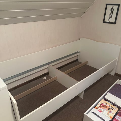 IKEA säng med förvaring i vit färg. Sängen har flera lådor och öppna fack under liggytan som kan användas för förvaring av kläder, sängkläder eller andra saker. Passa på med madrass 1000 måste bort senast 28/3