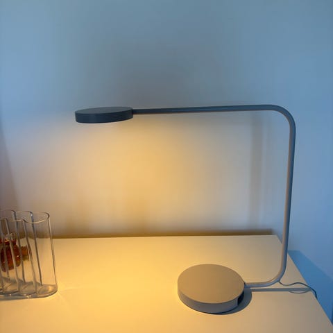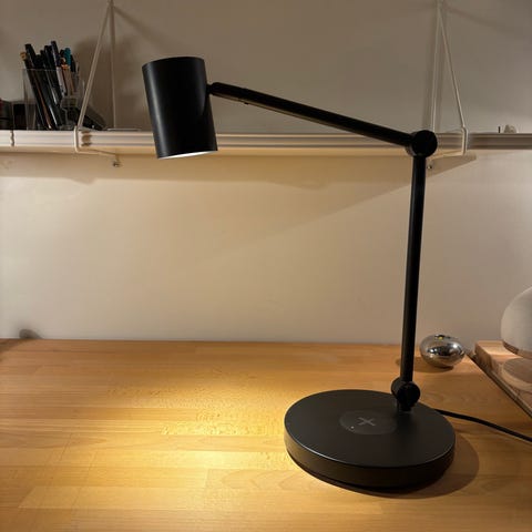 Justerbart lamphuvud, touch på/av och dimning. Plattan fungerar som avställningsyta och laddningsstation via USB-port.