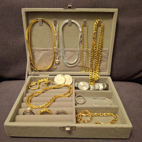 Säljer metalllåda/ skrin av vit metall med gulddetaljer, köpt på jollyroom.