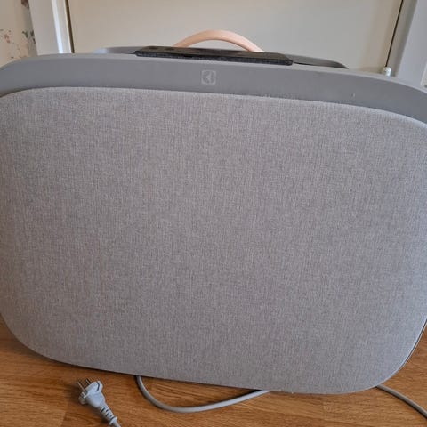 Electrolux luftrenare i grå färg. Enheten har avtagbar frontpanel och är utrustad med fläkt och filtersektion på baksidan. På ovansidan finns kontrollpanel med strömknapp. Luftrenaren använder utbytbart filter samt förfilter, som båda kan tas loss för rengöring eller byte. Passar för inomhusbruk i hem- eller kontorsmiljö för filtrering av rumsluft.