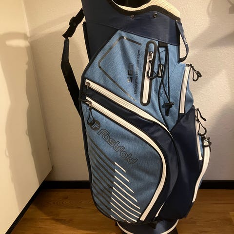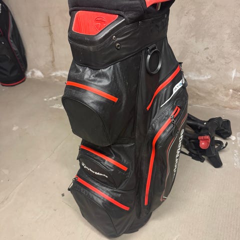 Golfbag i svart och rött. Flera fack för klubbor, bollar och tillbehör samt ytterfickor för förvaring. Regnskydd. Bärhandtag och rem för enkel transport. Passar för användning på golfbana med vagn eller bärning.