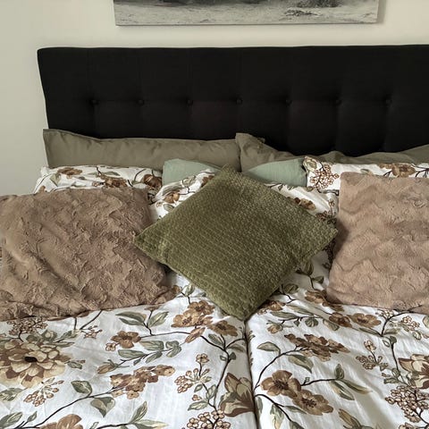 Jättefin sänggavel från IKEA. Går att fästa på sängramen och blir då högre (på bilden står den på golvet framför sängen). Ett litet hål, se bild. Inget som stör.