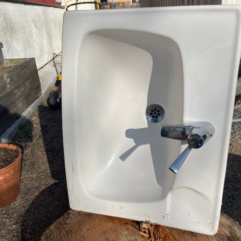 Rostfri väggmonterad tvättställsho i metall. Rektangulär form med rundad ho och avloppsanslutning undertill. Utrustad med uppvikt bakkant för montering mot vägg. Vita väggkonsoler medföljer för upphängning. Passar exempelvis i tvättstuga, båt, groventré, garage eller verkstad för enklare disk och rengöring.