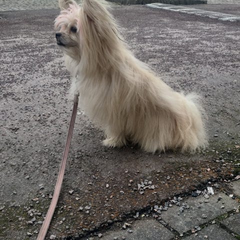 Han har testat att gå lite i koppel och kommer fortsätta att öva mer. Han är lyhörd, kommer när man ropar och är en ganska aktiv hund som alltid är glad.