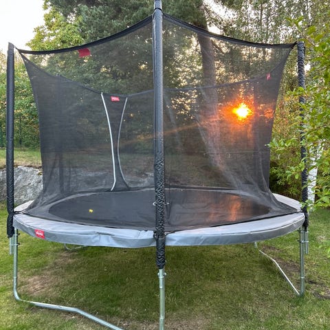 Adrenalin Advanced studsmatta med rund form, säkerhetsnät och stege. Studsmattan står på metallram med ben i stål och har skyddsnät runt hoppytan för ökad säkerhet. Slitet nät på en sida. Stege ingår för enklare åtkomst till studsmattan. Lämplig för utomhusbruk i trädgård.