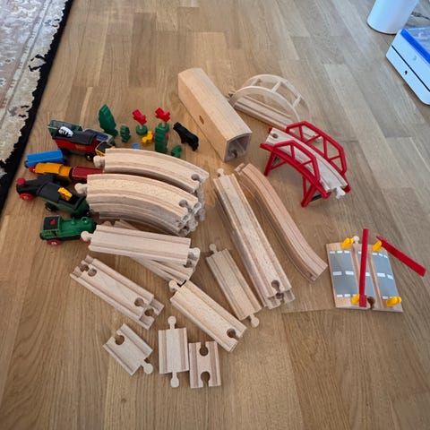 BRIO trätågbaneset med räls och tåg. Setet innehåller raka och böjda trärälsdelar, brodelar samt flera färgglada tåg, vagnar, hus och tillbehör. Passar för lek på golv eller matta och kan kombineras med andra BRIO-delar i samma system. Tillverkat i trä med målade detaljer, anpassat för barnlek med tåg och järnvägsmiljö.
