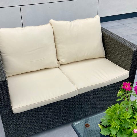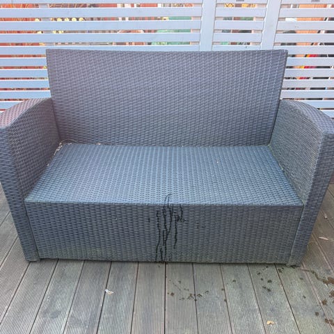 Soffa för balkong i konstrotting med tillhörande sitt- och ryggdynor i ljusgrått tyg. Mörkgrå/svart stomme i flätad konstrotting. Passar för användning utomhus på balkong, altan eller uteplats. Sitsen är utformad för två personer och dynorna ger en mjukare sittkomfort. Säljes med eller utan dynor. Med dynor 600kr utan dynor 400kr