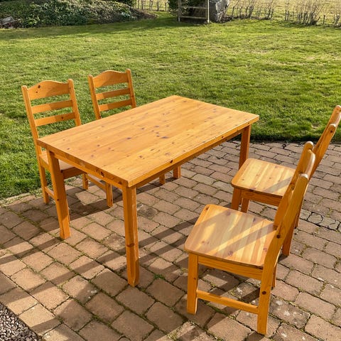 Detta lantliga matbord & stolar har finslipats & ytbehandlats med mörkare bets 🤍