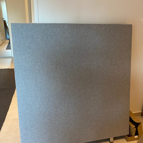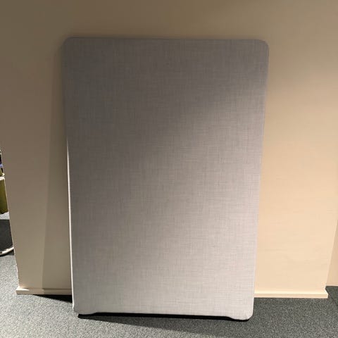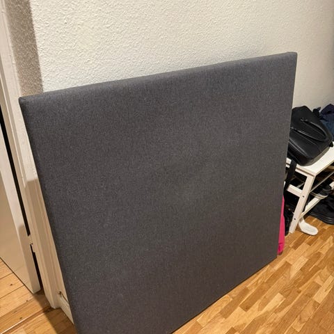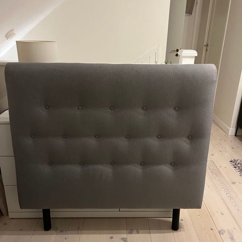 Jysk sänggavel i grå textilklädsel.