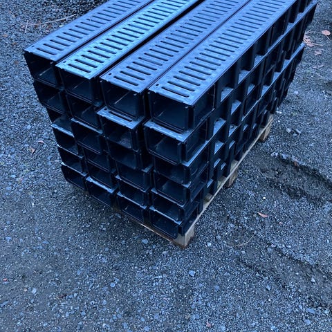 En komplett sats hängrännor med tillhörande stuprännor och upphängningskrokar.