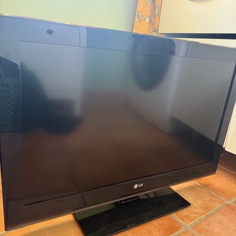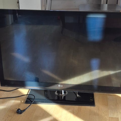 LG TV i svart utförande. Platt skärm med bordsstativ. Strömkabel och anslutningskabel syns på bilden. Passar för användning som vanlig TV eller som extern skärm till exempelvis digitalbox eller annan mediaenhet, beroende på tillgängliga anslutningar på baksidan av enheten.