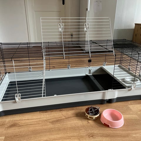 Buren är stor och rymlig och lätt att hantera när man ska göra rent i buren, då det även går att öppna buren ovanifrån. Vi har varit väldigt nöjda med buren.