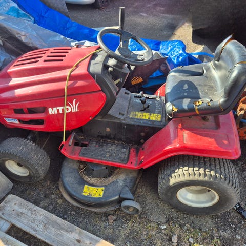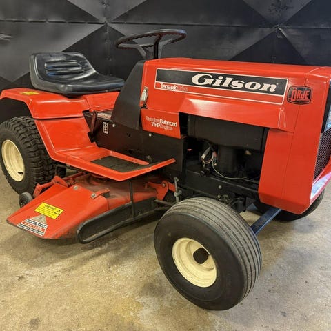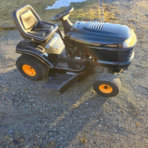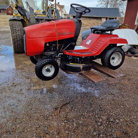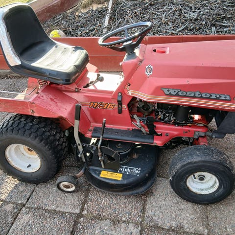 Weed Eater åkgräsklippare i grön färg. Modellen är utrustad med rattstyrning, sits med ryggstöd och klippaggregat monterat under maskinen. Passar för klippning av större gräsytor där man vill sitta och köra i stället för att gå bakom en vanlig gräsklippare. Drivs av bensinmotor (ej närmare specificerad). Maskinen har luftgummihjul anpassade för trädgårdsunderlag och fotplattor på båda sidor om sitsen för stabil körställning. Prisförslag. Kan bytas mot duglig motorsåg