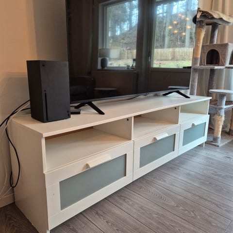 Fin tvbänk i vit högglans, bra skick. Nån smårepa här och där normalt slitage, inget märkvärdigt