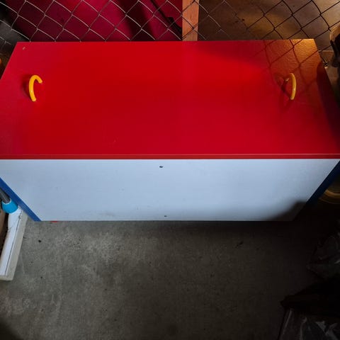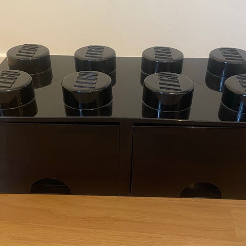 Lego förvaringslådor i form av en stor legokloss. Lådorna är ljusblå och grå plast med åtta knoppar på locket. Den består av en underdel och ett avtagbart lock. Säljes tillsammans.