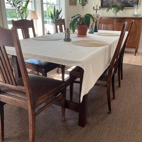 Matbord i trä med rektangulär bordsskiva i brun nyans. Bordet har även två extra skivor som kan användas för att förlänga bordet. Passar som matbord i kök eller matsal och ger plats för flera sittplatser längs långsidorna.