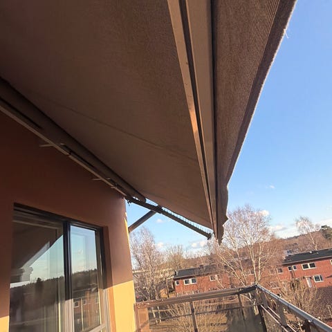 Balkongplattor i trallutförande för utomhusbruk. Plattorna är i rödbrun färg och verkar vara tillverkade i plast eller kompositmaterial med räfflad yta och mönsterlagd struktur. De är lagda på en balkong och passar för exempelvis balkong, uteplats eller altan. Plattorna klickas normalt ihop och ger ett jämnt golv över befintligt underlag. Vissa plattor är kapade för att passa balkong bättre, se bild 1. Allt säljes i befintligt skick.