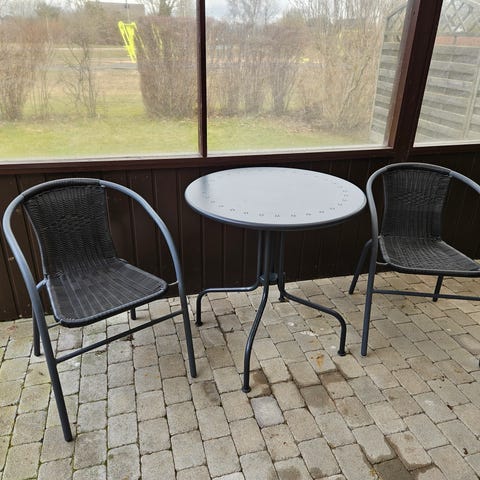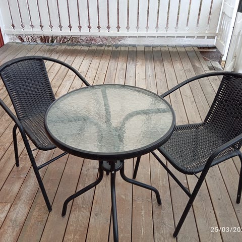 Bord med skiva av glas samt två stapelbara fåtöljer.