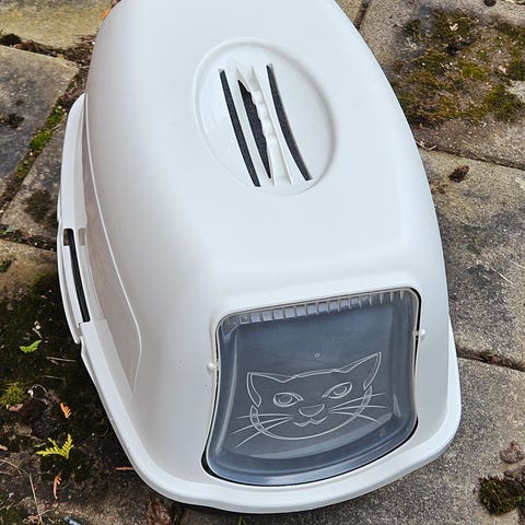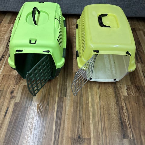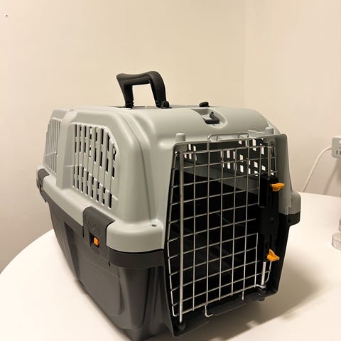 Transportbur för katt eller liten hund i plast i färgerna grå och svart. Buren har gallerdörr framtill och ventilationsöppningar på sidorna. Utrustad med bärhandtag på ovansidan för enklare förflyttning. Lämplig för transport av mindre sällskapsdjur, till exempel vid bilresa eller veterinärbesök.