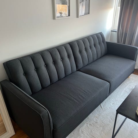 Skinn soffa från ikea, mått se bild. Använd i ca 3 år men väldigt bra skick! Finns i Vasastan med liten hiss, kan ej hjälpa till och bära. Hund finns i hemmet.