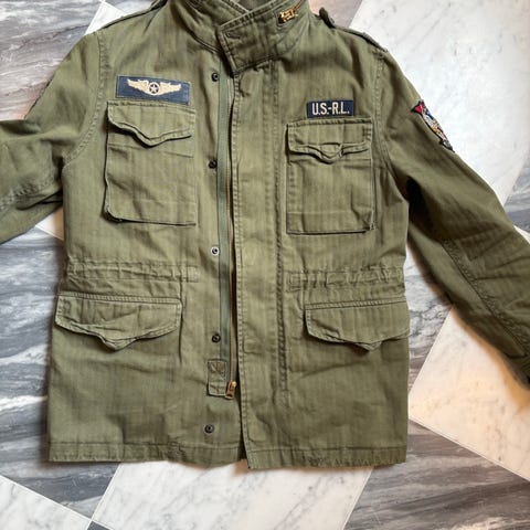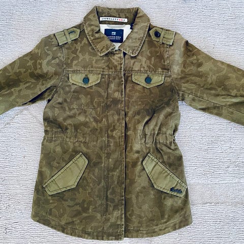 Militärgrön vårjacka, men blommor på insidan. Strl 140. I bra använt skick