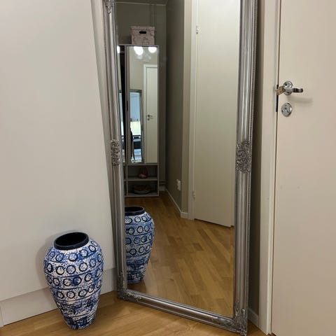 Jysk spegel i helkroppsmodell med dekorativ, silverfärgad ram. Rektangulär form som kan användas stående mot vägg eller monterad på vägg i exempelvis hall, sovrum eller vardagsrum. Passar som helkroppsspegel för daglig användning och inredning.