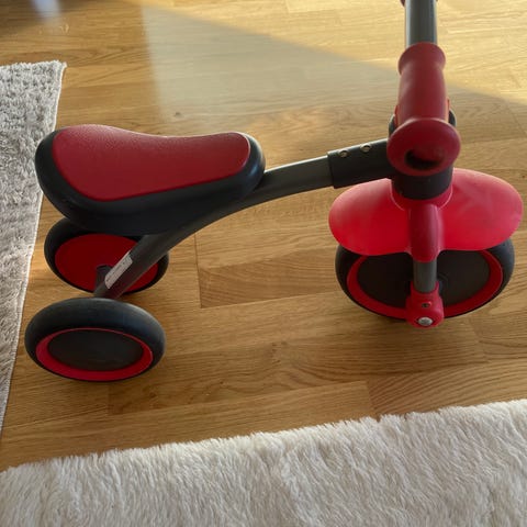 Barncykel trehjuling med hjulstorlek 10 tum i svart och beige färg. Cykeln har tre hjul för stabilitet, pedaler fram och en sits med ryggstöd och handtag. Lämplig för mindre barn som ska öva balans och trampning på en första cykel.