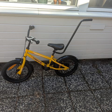 Säljer barncykel i 12 tum från Sjösala med tillhörande hjälpinne. Cykeln är använd av vår 3 åring.