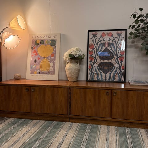 Sideboard / vitrinskåp i trä med hyllor och lådor