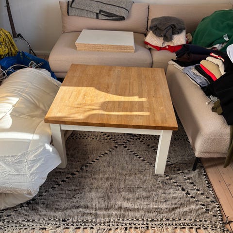 **500 EHB** IKEA soffbord i träfaner med två nivåer. Övre bordsskiva och en lägre hylla ger extra avlastningsyta för till exempel böcker, tidningar eller fjärrkontroller. Passar som soffbord eller sidobord i vardagsrum eller tv-rum. Från ett rökfritt hem med hund.