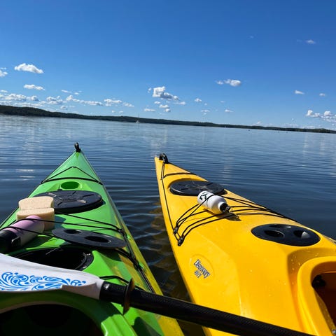 Fiskekajak av sit-on-top-typ i grön kamouflagefärg. Kajaken har upphöjd stol med ryggstöd och fotstöd för bekväm sittställning. Fram finns rund lucka med lock för förvaring av utrustning. Modellen är avsedd för fiske eller fritidspaddling på sjöar och lugnare vatten. Passar en person och har öppen däckslayout som underlättar åtkomst till fiskeutrustning och annan packning.