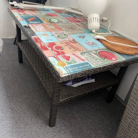 Bord i naturfärgad rotting med metallunderrede. Översta skivan är flätad i rotting och under finns en hyllplan i liknande material. Passar exempelvis i hall, vardagsrum eller uteplats under tak. En enkel, rektangulär modell med smalt stativ i metall som ger ett lätt intryck. Mått L 124cm Höjd 47 cm B 45 cm