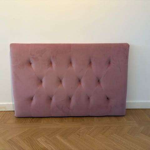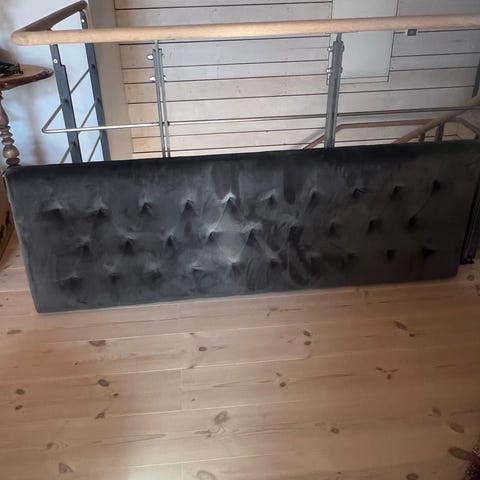 Ellos sänggavel i beige sammet - textilklädsel. Sänggaveln har stoppad, vadderad front med knapptuftad design och är avsedd att placeras bakom en säng.