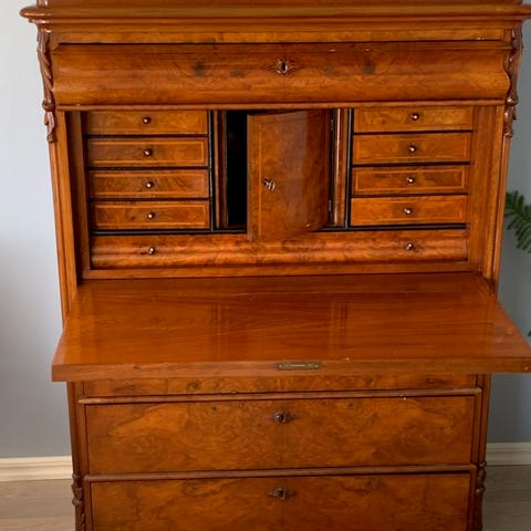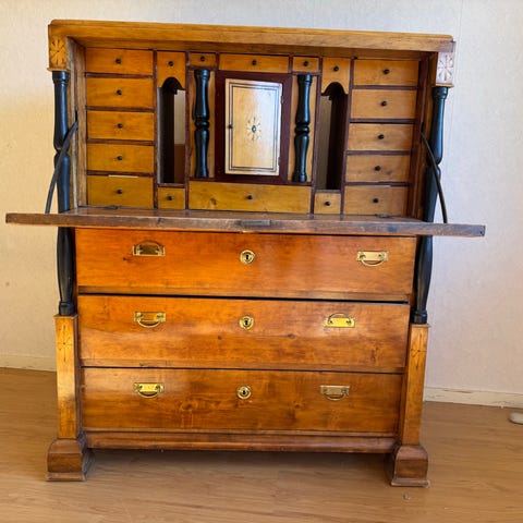 Sekretär byrå i brunlaserat trä med klaffskiva. Överdelen har flera små lådor och fack för förvaring av mindre saker och papper. Underdelen består av tre större lådor som ger gott om utrymme för kläder, textilier eller andra föremål. Möbeln passar som skrivplats och förvaring i vardagsrum, sovrum eller arbetsrum.
