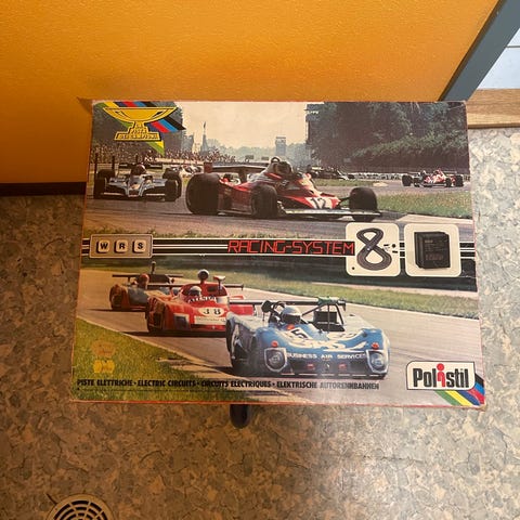 Stiga Formula Tyco Grand Prix bilbana för barn. Setet innehåller bilbanedelar i plast med raka och kurvade spår, räcken och tillbehör i huvudsak i svart och gult. Avsedd för elektriska leksaksbilar som körs i spåren runt banan. Passar för inomhuslek och kan byggas ihop till olika bansträckningar enligt medföljande instruktioner om dessa finns kvar.