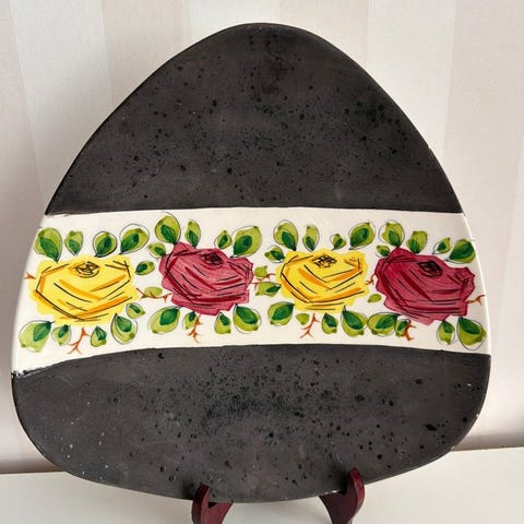 Ovansidan har ett dekorativt fisk- och havsmotiv i flera färger mot mörk bakgrund. Undersidan är blå och försedd med upphängningsanordning, vilket gör att fatet kan användas både som serveringsfat och som väggdekoration.