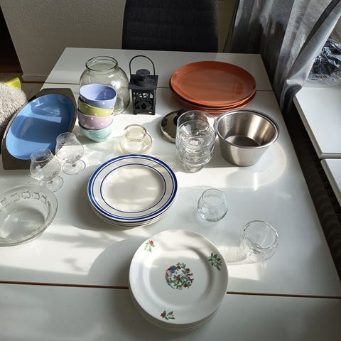 Köksutrustning och porslin set med flera delar. Setet innehåller olika typer av glas, bland annat dricksglas och vinglas i klarglas. Det finns vita tallrikar i olika storlekar, några assietter med mönster, samt skålar i vitt porslin. I setet ingår även ugnsformar i glas och en rektangulär serveringsform i vitt porslin. På köksredskapssidan finns knivar, träredskap som slevar och salladsbestick, visp, stekspade samt några lock, kastrull, rivjärn och mindre köksredskap. Passar som grunduppsättning till kök med blandade serverings- och matlagningsdelar.