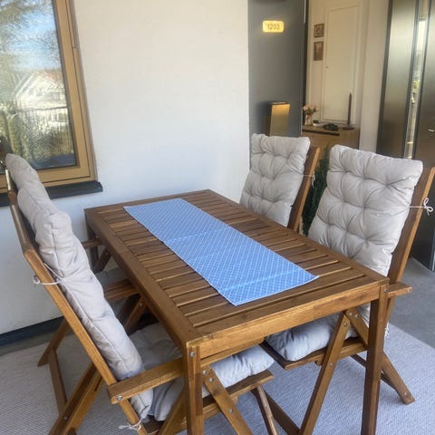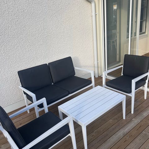 Utemöbelset bestående av en soffa, två fåtöljer och ett rektangulärt bord. Stommarna är i mörkt metallutförande med flätad rotting eller rottingliknande material i naturfärg. Sitt- och ryggdynor är ljusa och anpassade för utomhusbruk. Bordet har en plan glasbordsskiva som ger en jämn yta för servering. Passar för uteplats, altan eller trädgård där flera personer kan sitta tillsammans.