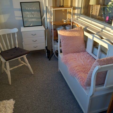 Sittbänk, pläd och hatthylla