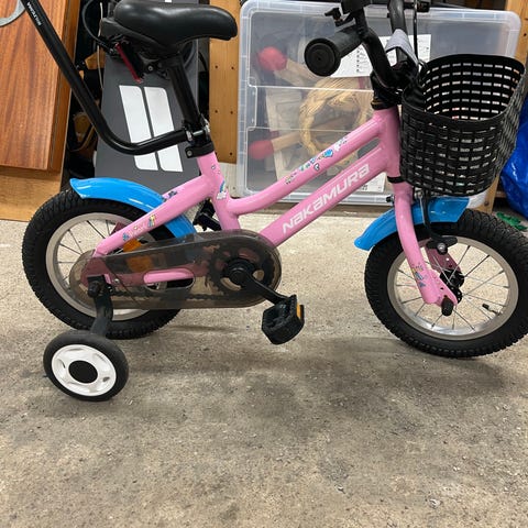Barncykel med 12" hjul i vit och rosa färg. Utrustad med stödhjul, kedjeskydd, handtag med grepp och ringklocka på styret. Passar yngre barn som ska lära sig cykla, med låg ram och justerbar sadel för att kunna anpassas efter barnets längd.