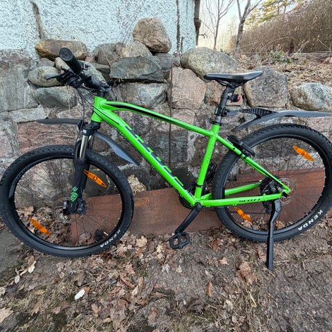 Scott mountainbike för unisex med ramstorlek S och 27,5" hjul. Cykeln har grön aluminiumram med hardtail-konstruktion, dämpad framgaffel och raka styre. Utrustad med grovmönstrade däck anpassade för terrängkörning. Passar för stigcykling och vardagscykling på grus- och skogsvägar för förare som trivs med en mindre ramstorlek.