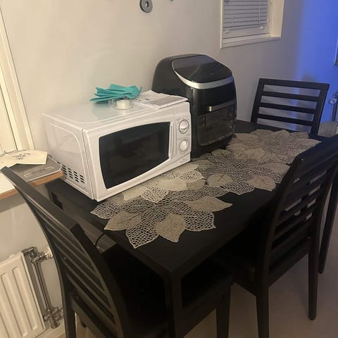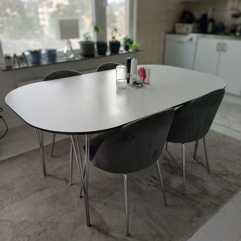 Hej! Jag säljer mitt matbord som går att hämta i Stuvsta. Stolarna och matbordet är i bra skick. Lite märken på skivan men går att måla bort.