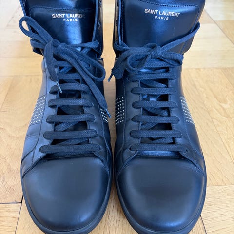 Bally skor i herrstorlek 43. Modellen är ett par högre sneakers i grå ton med röda och vita detaljer samt snörning framtill. Skorna har vit sula och rem med textdetalj runt ankeln. Passar som vardagsskor eller fritidsskor. Skicket är mkt gott då dom bara är använda 2ggr ( se sula) . Jag säljer pga dom är lite för små för mig . Nypris 4499